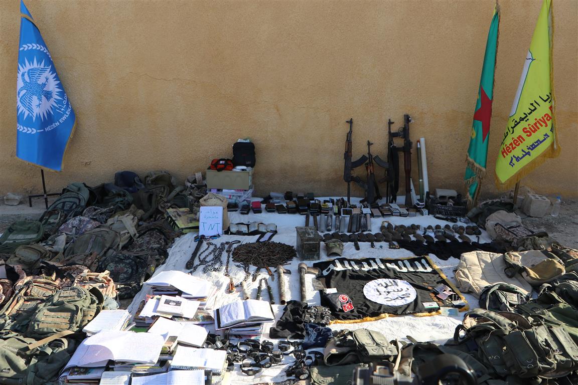 3 Sturmgewehre des Typs AK-47, mit denen 2 Kämpfer der SDF während der Einsätze getötet wurden, eine RPG mit zwei Raketen, zwei Pistolen, 25 Handgranaten, 25 kg TNT, 11 Schalldämpfer, 388 Schuss Munition und 10 Magazine für die AK’s, 9 Köcher sichergestellt