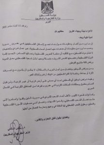 Entsetzen und Wut über die Wohnsiedlungen für die Palästinenser in diesem Gebieten seit 2018. Das Ministerium drückte im Brief ihre klare Ablehnung gegenüber jeglichen Plänen der Ansiedlung von Palästinensern in das hauptsächlich von Kurden bewohnte Afrin aus. Ferner würden die Vereine, die am Bau der Wohnsiedlungen beteiligt sind, Palästina nicht repräsentieren. Das Ministerium forderte auch, dass die Menschenrechtsverletzungen und die Enteignung von kurdischem Eigentum in Afrin beendet werden.