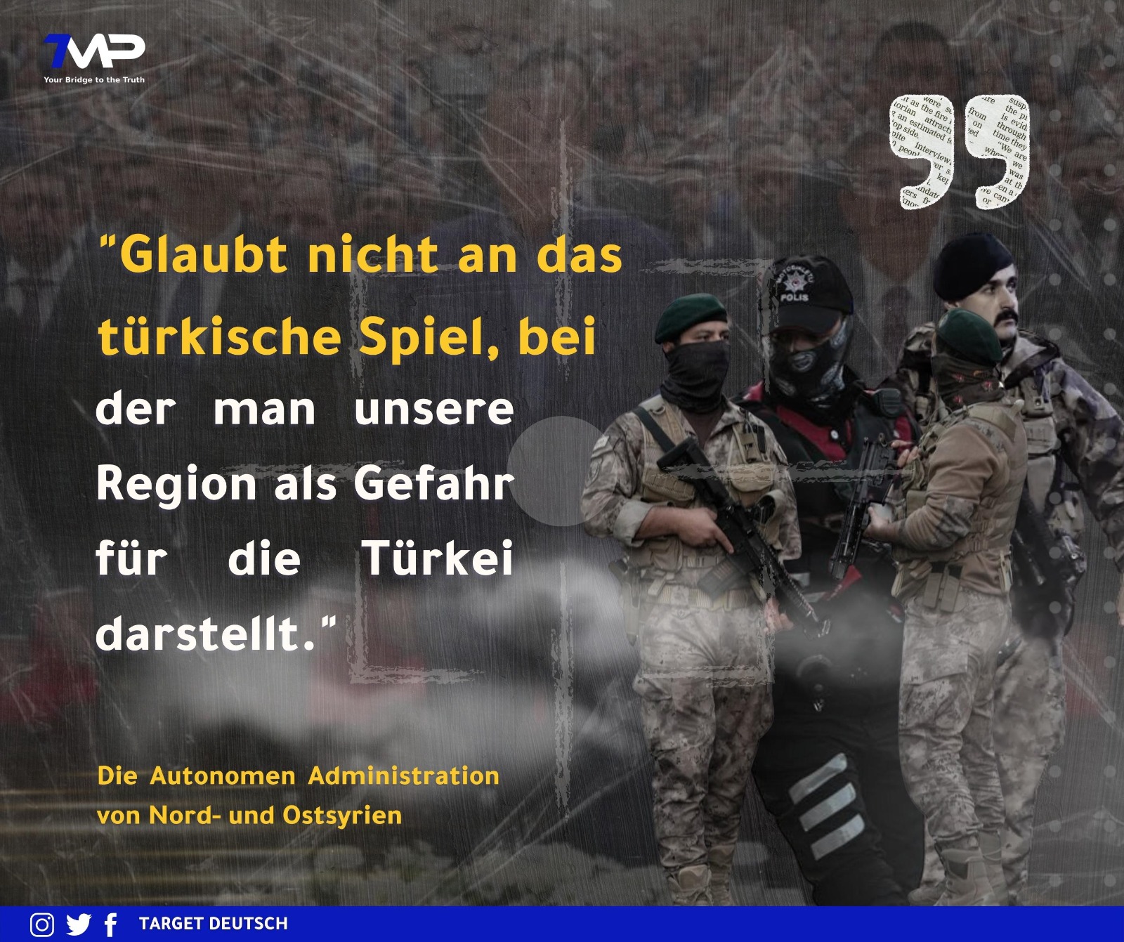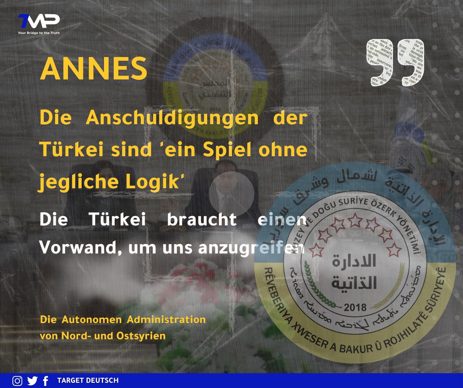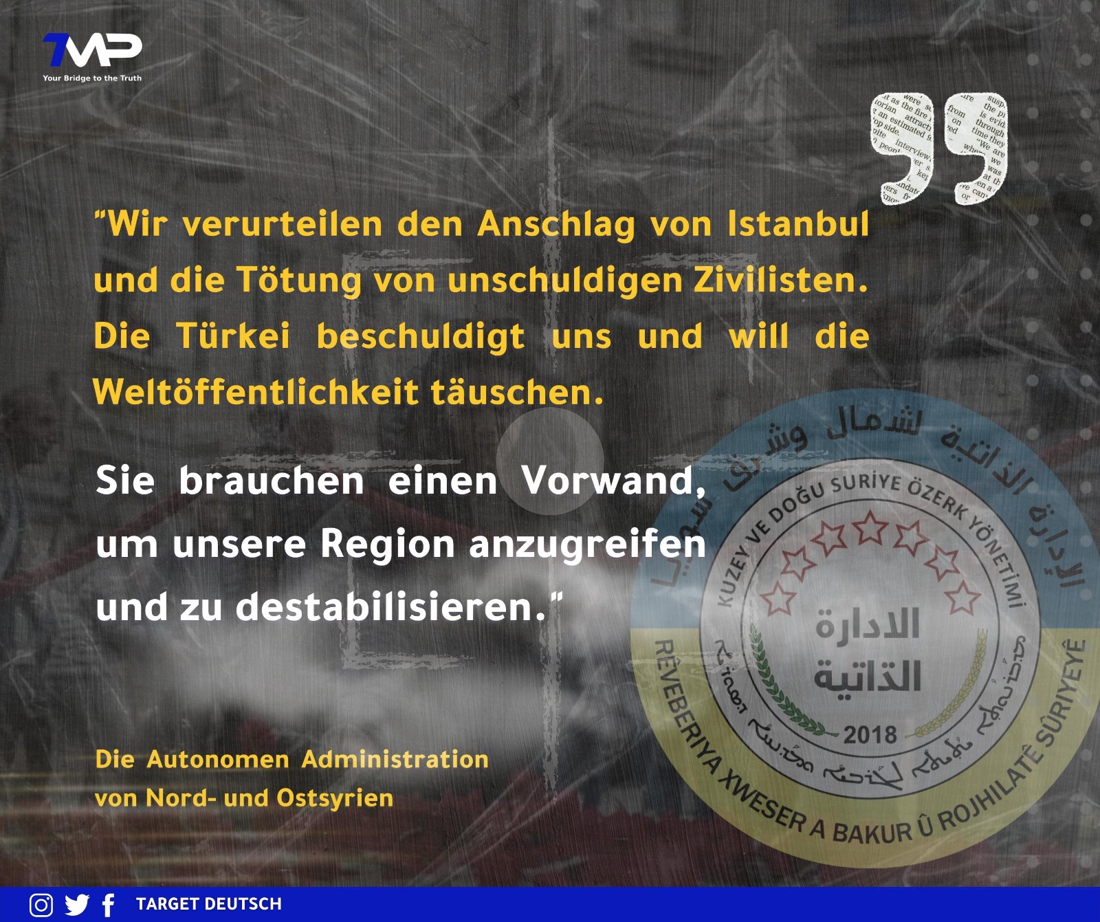 In der Erklärung heißt es, dass die Türkei die öffentliche Meinung manipulieren wolle und dies zur Praxis der Türkei und ihrer Geheimdienste gehöre. Nach dem Anschlag in İstanbul habe die Türkei sofort die Autonome Administration und ihre militärischen Kräfte beschuldigt. Man verurteile den Anschlag in İstanbul und die Tötung von unschuldigen Zivilisten. Die Anschuldigungen seien jedoch Teil der türkischen Politik und Agenda, bei der man einen Vorwand schaffen wolle, um die Region anzugreifen und zu destabilisieren. Die Türkei erschaffe immer wieder Szenarien und Lügen, die nichts mit der Wahrheit zu tun haben würden.