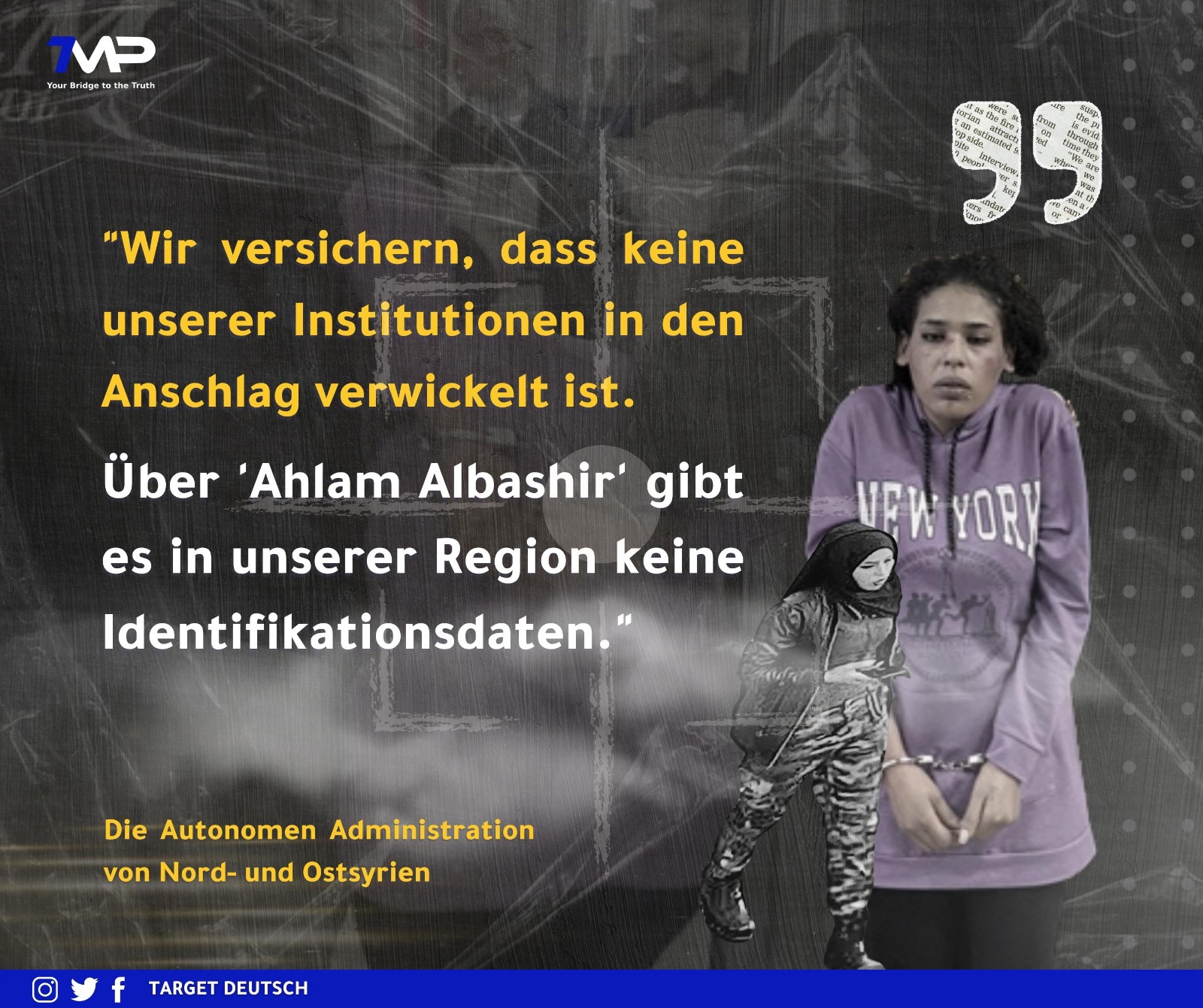 Das Büro für Außenangelegenheiten versicherte weiter, dass keine Institution der AANES beim Anschlag eine Rolle spiele und die türkischen Anschuldigungen ‘ein Spiel ohne jegliche Logik’ seien. Der Hauptverdächtige sei die Türkei, die durch die falschen Anschuldigungen die Fakten und die Wahrheit verdrehen wolle. Außerdem wurde bekräftigt, dass die beschuldigte Frau Ahlam Albashir in der AANES keine Identifikationsdaten habe.