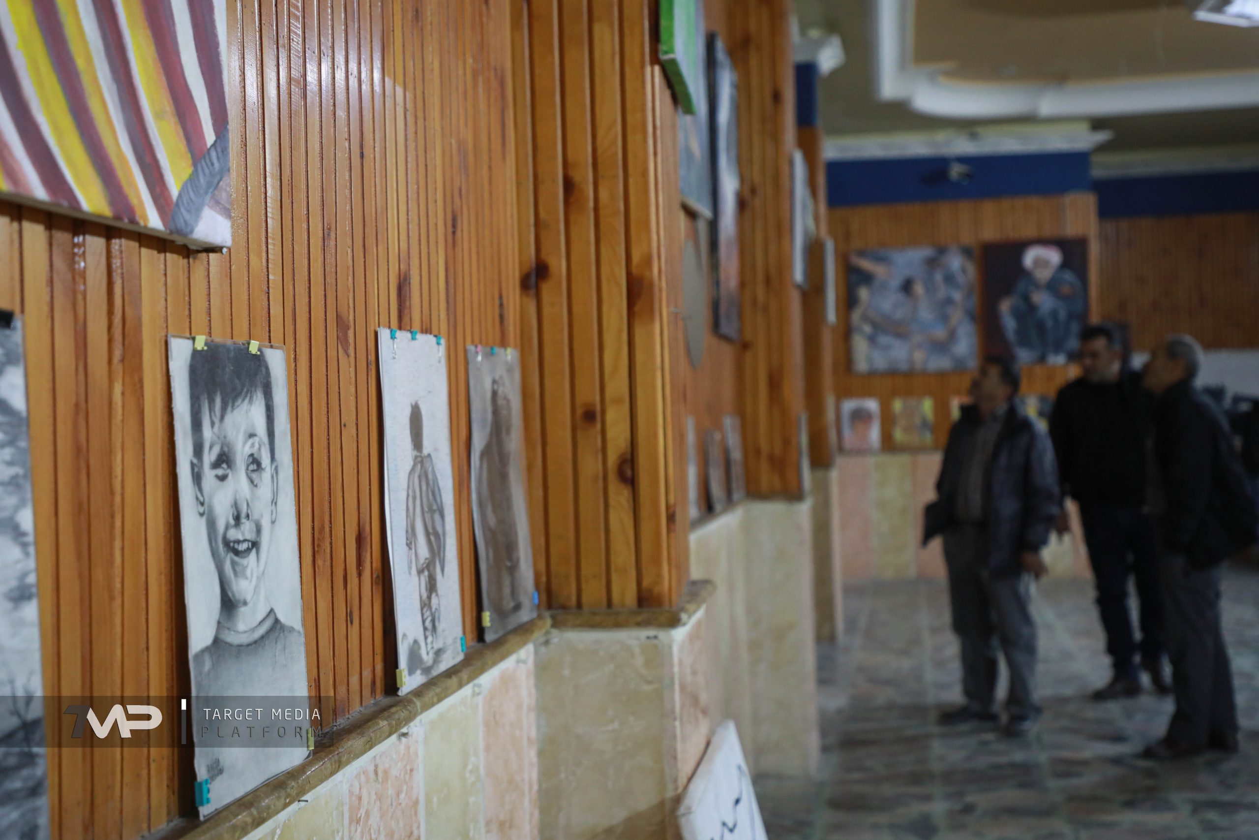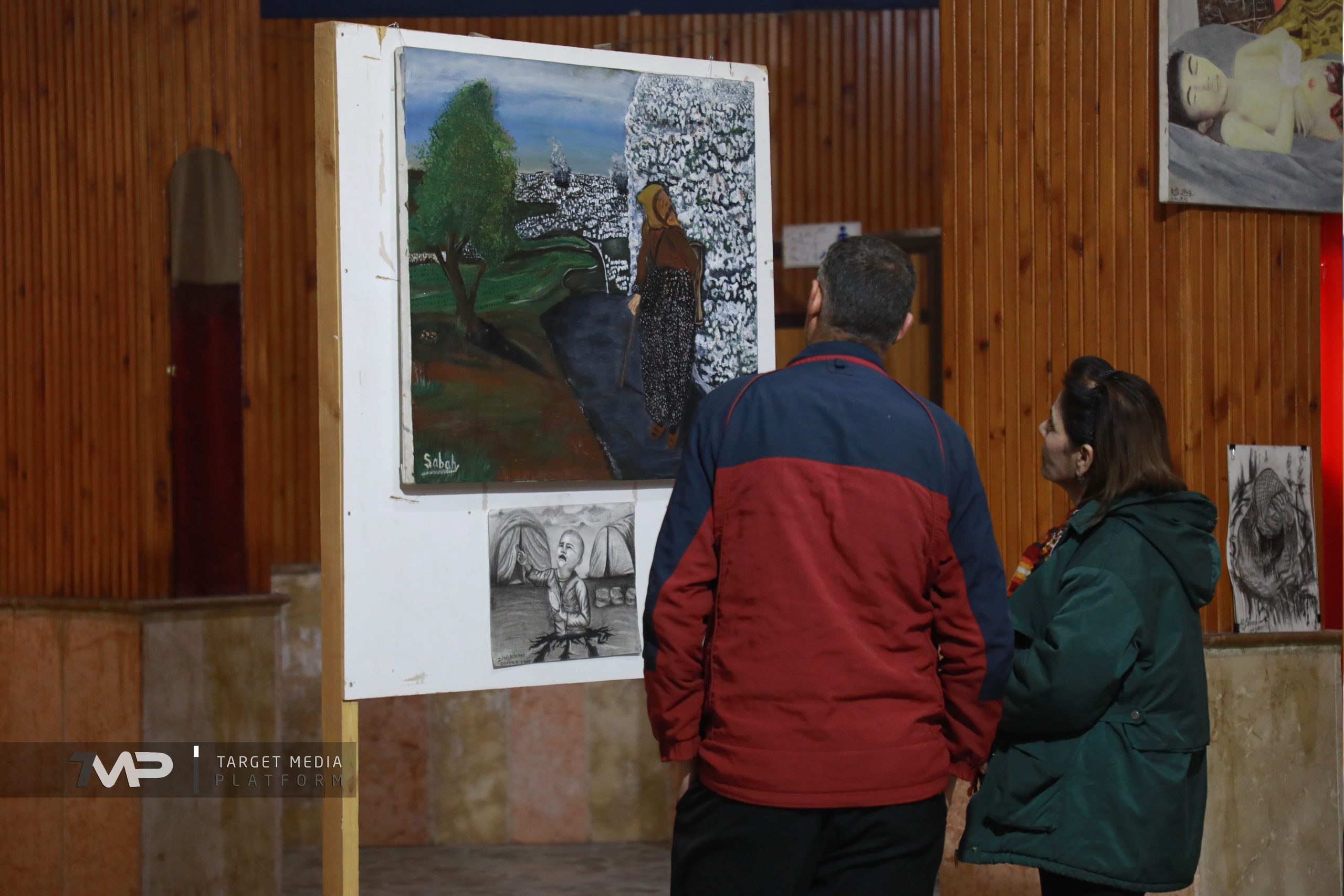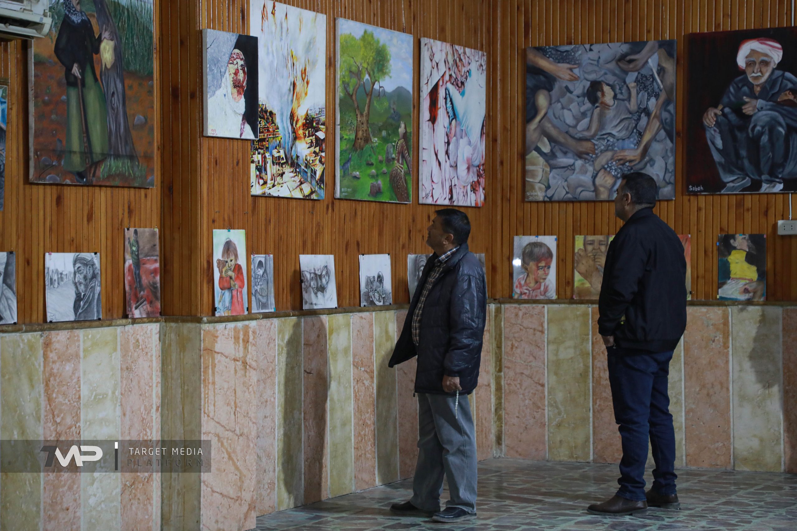 Die Ausstellung zeigt Gemälde von vertriebenen Kindern aus der Stadt Afrin, die in Lagern für Vertriebene in den Vierteln al-Shahba, Sheikh Maqsoud und Ashrafieh in Aleppo für Sicherheit sorgen.