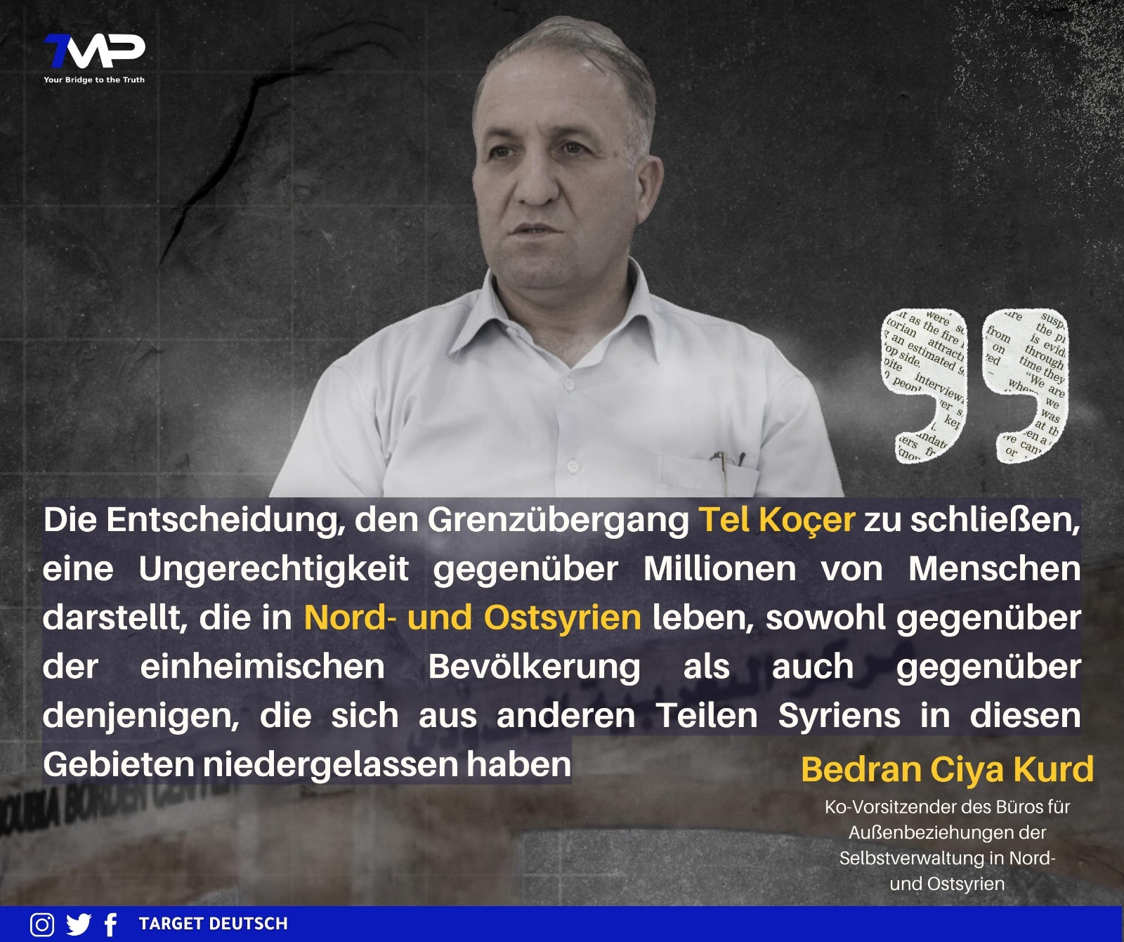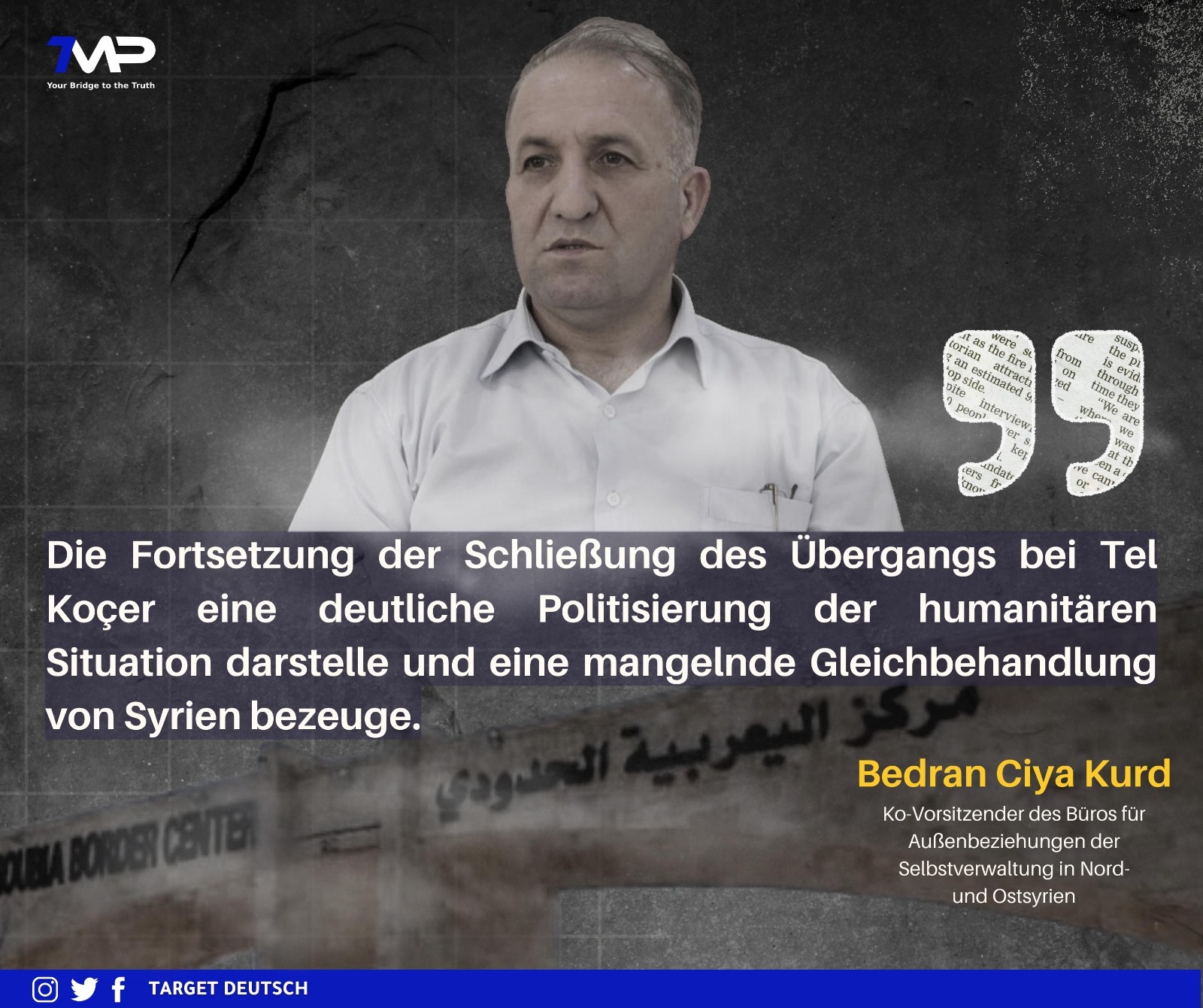 Bedran Ciya Kurd, Ko-Vorsitzender des Büros für Außenbeziehungen der Selbstverwaltung in Nord- und Ostsyrien, erklärte in einem Interview, dass die Fortsetzung der Schließung des Grenzübergangs bei Til Koçer an der irakischen Grenze eine deutliche Politisierung der humanitären Situation darstelle und eine mangelnde Gleichbehandlung von Syrien bezeuge.